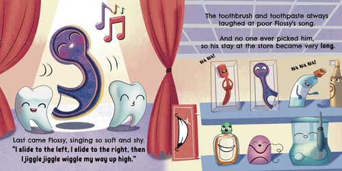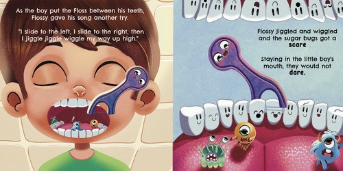 Shy Flossy the Floss has an important job to do. There are sneaky sugar bugs hiding between a little boy’s teeth that only Flossy can defeat. Is Flossy up to the challenge? Will his jiggle wiggle song and dance be enough to scare the sugar bugs away? Flossy’s exciting dental journey is sure to have your little one eagerly flossing as they sing his song!